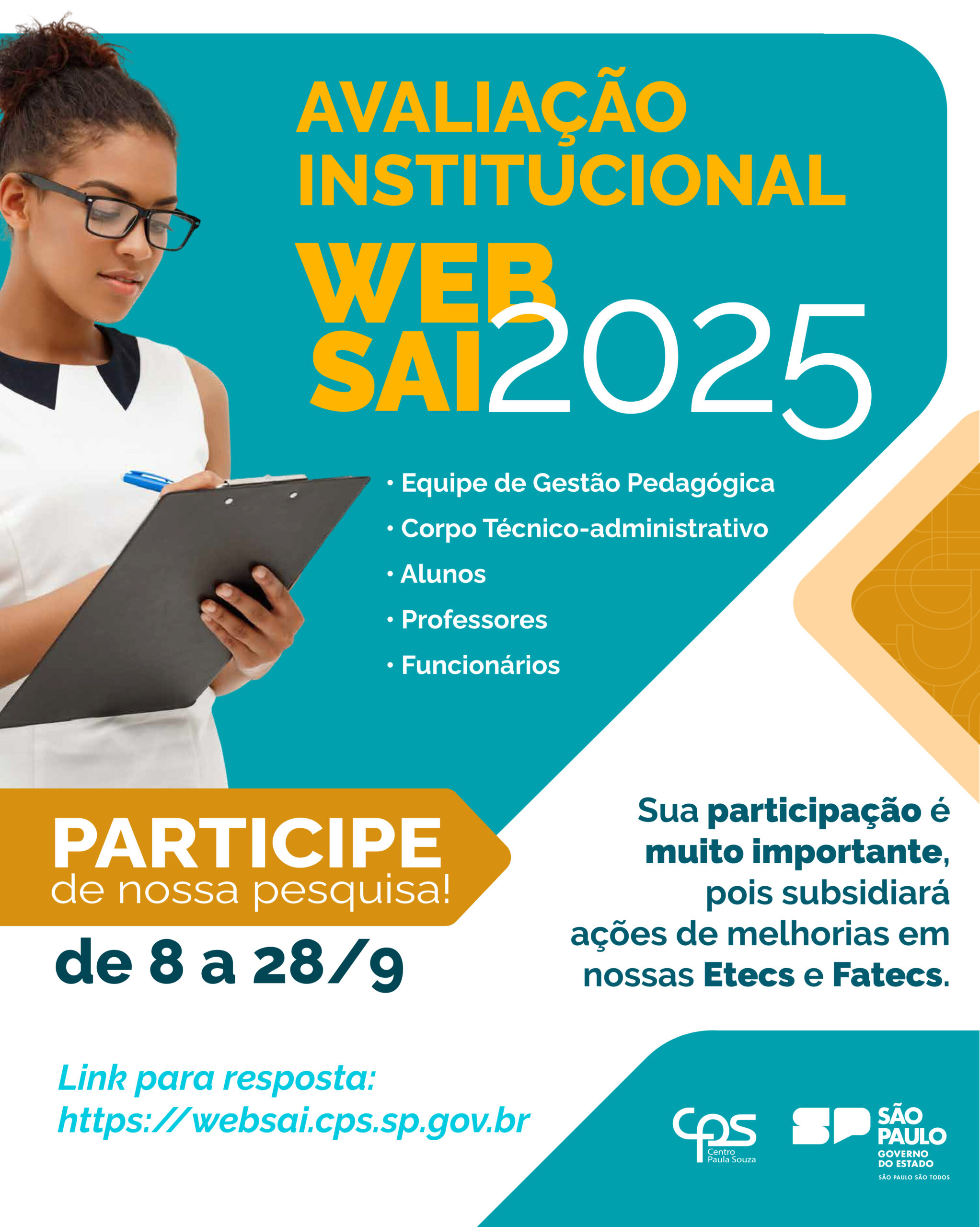 A participação de todos é muito importante, pois sabemos que se trata de uma ferramenta institucional para promover melhorias na qualidade de ensino e auxiliar as equipes de gestão.